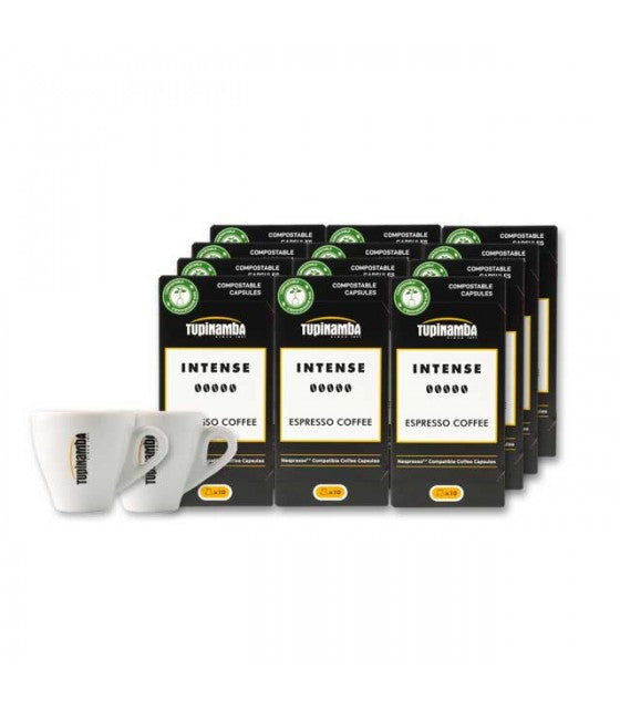Cada caixa conté 10 càpsules compostables Intense de cafè mòlt de torrat natural. Un total de 120 càpsules compostables de cafè i 2 Tasses Tupinamba. Càpsules compatibles amb les cafeteres Nespresso ®️ *.